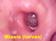 2) Larvas: consulta por intenso dolor otorragia o supuración serosanguinolenta (hay antecedente de otitis media crónica, entrada de mosca y posterior dolor intenso)